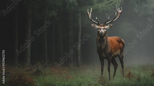 © Boonnam Burart, Fototapeta premium Red deer standing proud in a misty morning forest