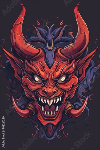 Fototapeta premium Red demon mask with horns, fangs, and glowing eyes.