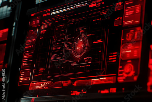 © Home StudioX, Obraz premium Red digital interface screen showing data, code, and system information.