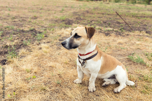 Obraz premium Red dog playing on the yellowed lawn. Shallow depth of field. Toned.