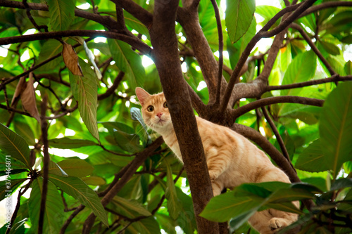 © khanfus, Obraz premium red, domestic, funny cat, sitting on a tree with green leaves