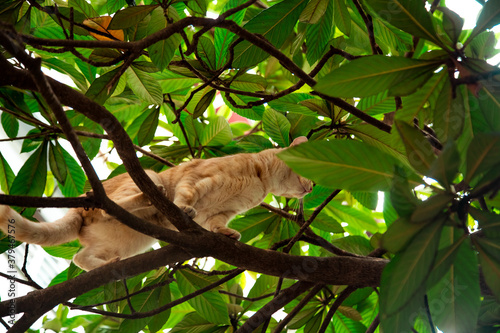 © khanfus, Fototapeta premium red, domestic, funny cat, sitting on a tree with green leaves