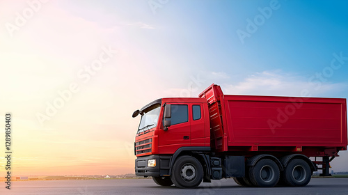 © artzone, Fototapeta premium Red Dump Truck at Sunset on Asphalt Road
