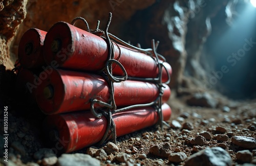 Fototapeta premium Red dynamite sticks bundled with wires, ready for use. Lay on rocky ground in dim underground mine cave. Light shines from above, creating dark, rugged scene for blasting operation. Shows danger.