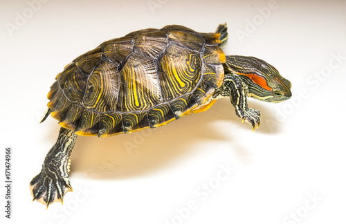 Fototapeta premium Red ear turtle escapes.White background.