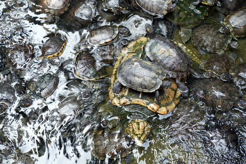 Obraz premium Red-eared freshwater turtles swim in the pond