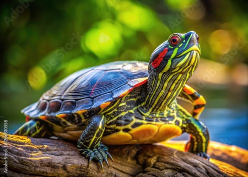 Fototapeta premium Red-eared slider basks, showcasing vibrant hues on sun-warmed log, a reptile...