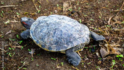 © Mang Kelin, Fototapeta premium Red-eared slider (red-eared terrapin, Trachemys scripta elegans, Trachemys scripta). The red-eared slider is included in the list of the world's 100 most invasive species