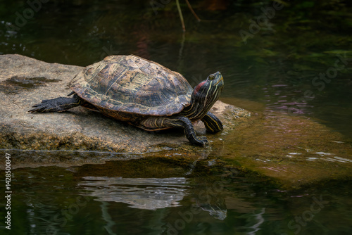 Fototapeta premium Red-eared Slider - Trachemys scripta elegans, beautiful colored invasive turtle from fresh waters, Singapore. Popular pet.