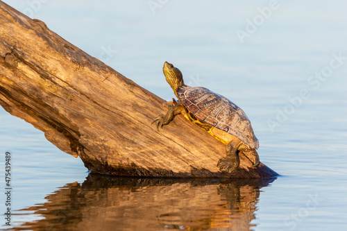 Obraz premium Red-eared Slider(Trachemys scripta elegans) on log in wetland Marion County, Illinois.