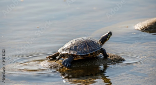 Obraz premium Red-Eared Slider Turtle Basking on a Rock in Calm Water