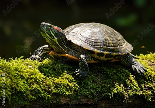 © Arie, Fototapeta premium Red Eared Slider Turtle basking on mossy log