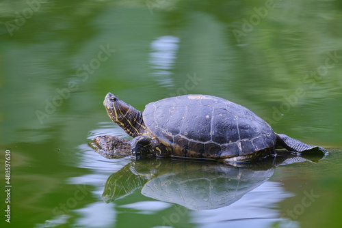 Obraz premium Red-eared slider turtle (Trachemys scripta), perched on a log basking in the sun in a small lagoon.
