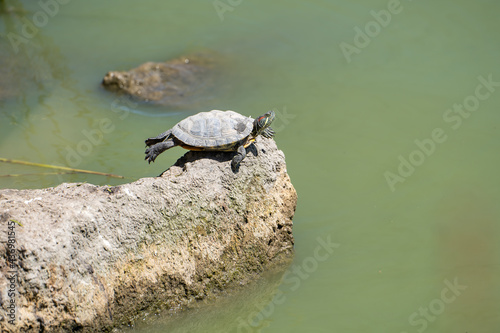 Fototapeta premium Red-eared turtle (Trachemys scripta elegans) resting on a rock in Lake Elizabeth