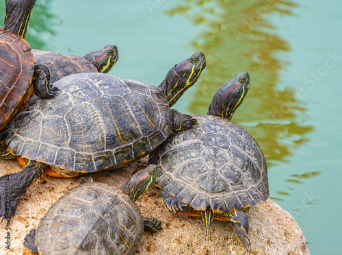 © AVD, Fototapeta premium red-eared turtles basking in the sun