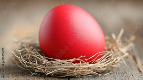© AGUNG, Obraz premium Red Easter egg in a nest on rustic wood