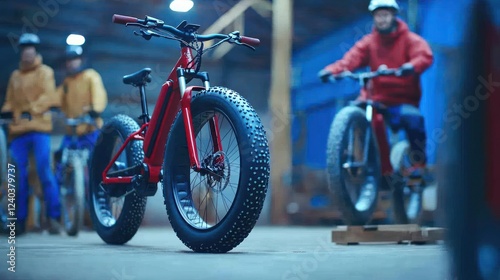 © slamet, Obraz premium Red Electric Fat Bike in Industrial Setting
