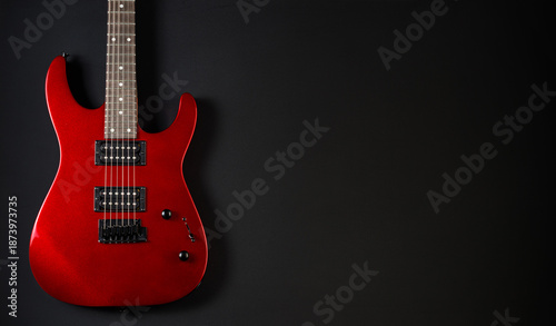 © Gresei, Fototapeta premium Red electric guitar against black background with copy space