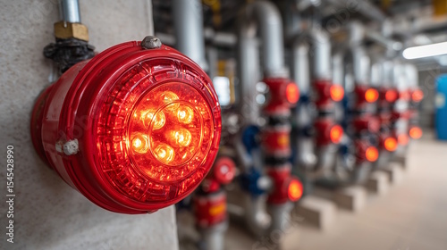 Obraz premium Red emergency warning light illuminating industrial piping system in a modern...