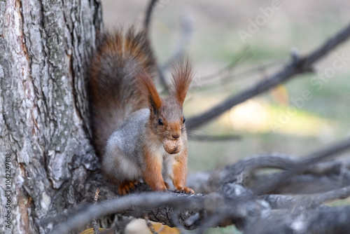 Fototapeta premium Red eurasian squirrel in autumn park