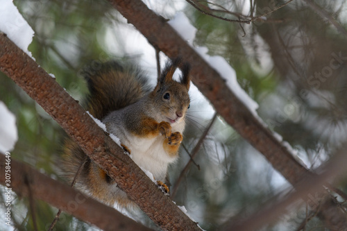 Fototapeta premium Red eurasian squirrel in winter park