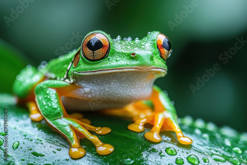 © Sofia, Fototapeta premium Red-eyed frog perched on leaf.