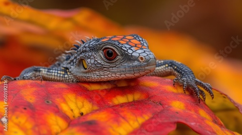 © DARYATIK, Fototapeta premium Red-eyed lizard resting on autumn leaf