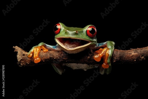© AGIL, Naklejka premium Red eyed tree frog on a branch smiling brightly