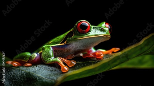© Ayan, Fototapeta premium Red-eyed tree frog on a leaf, black background