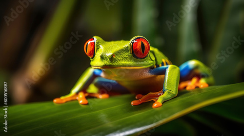 © Putra, Fototapeta premium Red Eyed Tree Frog on a Leaf with blurred Background. Generative Ai
