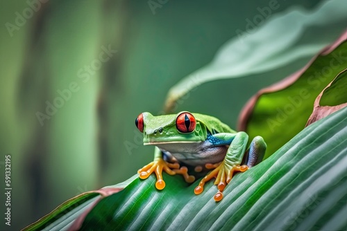 © The 2R Artificiality, Fototapeta premium Red-Eyed Tree Frog Perched on a Green Leaf. Generative AI
