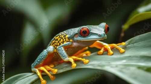 © Professional Agency, Obraz premium Red-eyed tree frog perched on a lush green leaf in the rainforest