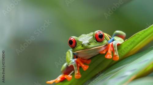Fototapeta premium Red-eyed tree frog rainforest leaf closeup, nature