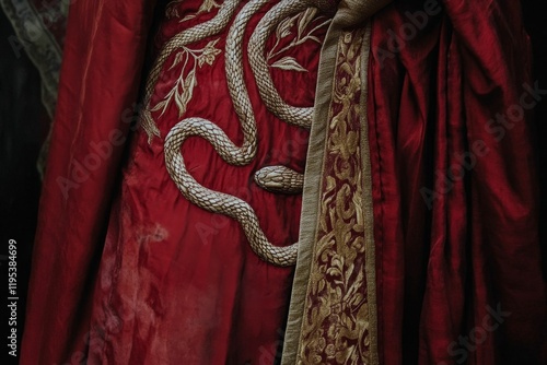 Fototapeta premium Red fabric, gold embroidery, serpentine design.
