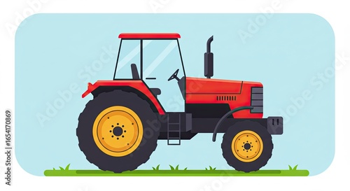 Obraz premium Red Farm Tractor on Green Grass Against Light Blue Sky