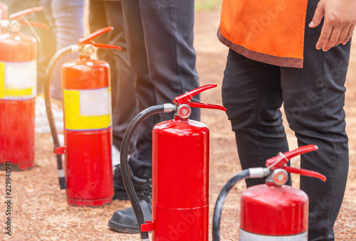 © Soonthorn, Naklejka premium red fire extinguisher dry chemical during basic fire fighting training and fire drill evacuation