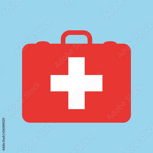 Fototapeta premium Red first aid kit isolated on blue background. Health care, help and medical first aid kit, vector icon.