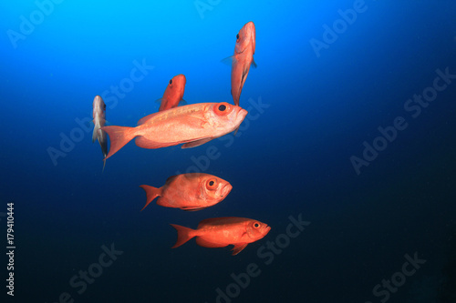 © Richard Carey, Naklejka premium Red fish blue background. Crescent tailed Bigeye fish. Red Snapper in ocean