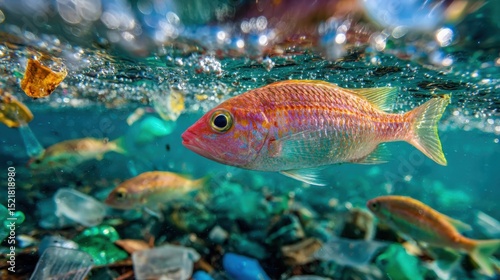 Fototapeta premium Red Fish Swimming Through Plastic Waste in Ocean, Illustrating Environmental...
