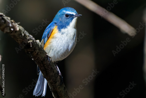 Fototapeta premium 羽ばたいて飛び出す幸せの青い鳥、可愛いルリビタキ(ヒタキ科) 英名学名:Red flanked Bluetail (Tarsiger cyanurus) 埼玉県北本市、北本自然観察公園 2024