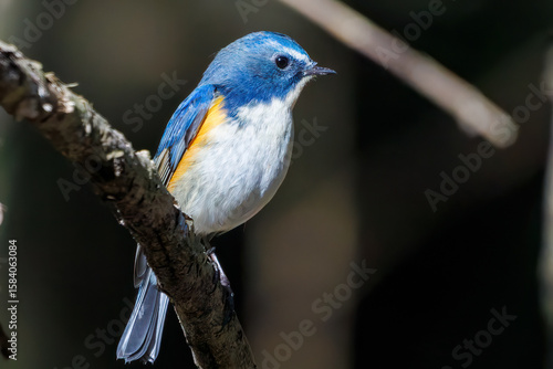 Fototapeta premium 羽ばたいて飛び出す幸せの青い鳥、可愛いルリビタキ(ヒタキ科) 英名学名:Red flanked Bluetail (Tarsiger cyanurus) 埼玉県北本市、北本自然観察公園 2024