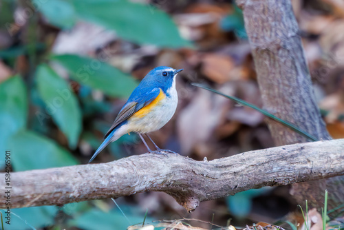 Fototapeta premium 羽ばたいて飛び出す幸せの青い鳥、可愛いルリビタキ(ヒタキ科) 英名学名:Red flanked Bluetail (Tarsiger cyanurus) 埼玉県北本市、北本自然観察公園 2024