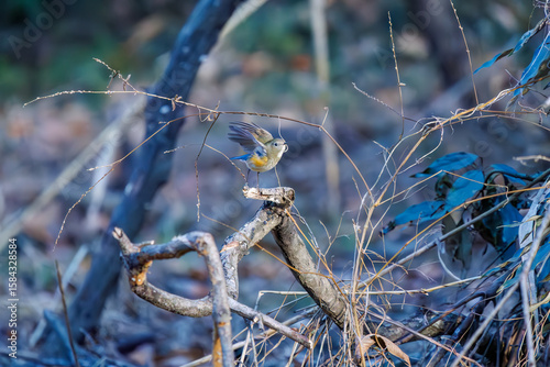 Fototapeta premium 羽ばたいて飛び出す幸せの青い鳥、可愛いルリビタキ(ヒタキ科) 英名学名:Red flanked Bluetail (Tarsiger cyanurus) 埼玉県北本市、北本自然観察公園 2024