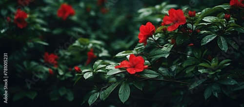 © Ilgun, Obraz premium Red flower blooming among vibrant green leaves on a tree branch