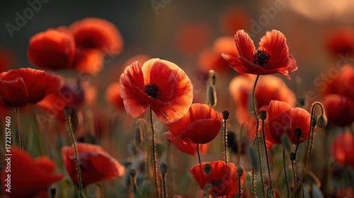 © Anna, Fototapeta premium Red flowers field, blurred background