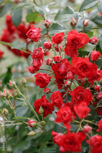 © eevlada, Fototapeta premium red flowers of a garden rose on a Bush close-up