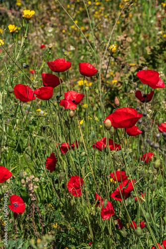 © Emma, Fototapeta premium Red flowers of blooming wild poppies among green grass