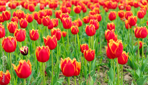 Obraz premium red flowers of fresh holland tulips in field. blossom