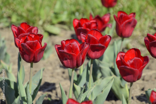© eleonimages, Obraz premium Red flowers of tulips on a flower bed. A flower bed with tulips