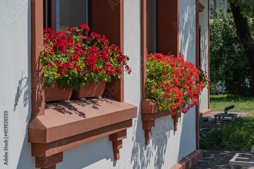Fototapeta premium Red flowers on a windowsill in a village house.